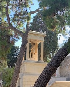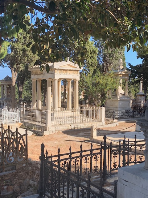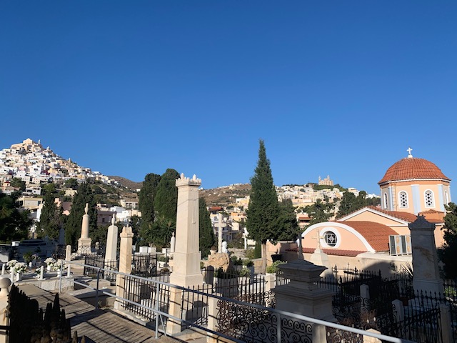 On Tuesday with Andy working on the anchor rode, I took myself off to walk to the cemeteries.  McGilchrist describes the Orthodox one as having ‘the most evocative assemblages of funerary sculptures in Greece…………comparable to Glasgow’s Western Necropolis’ – I must put that on my ‘to do’ list! I walked up a narrow cobbled street; there are always clues to the position of a cemetery in the flower and plant shops.  There were two on this road, the first opposite the Orthodox Cemetery which indeed was very impressive, the monumental marble and stonework a reflection of the wealthy 19th Century industrialist families of Syros.  All these were beautifully tended under green trees.  The only worrying thing was the realisation that a lot of the dead people were my age!  Also there was the Ossuary, the building that houses the bones of the deceased, traditionally dug up and washed with wine, four years after burial.  I’m not sure if this still happens.