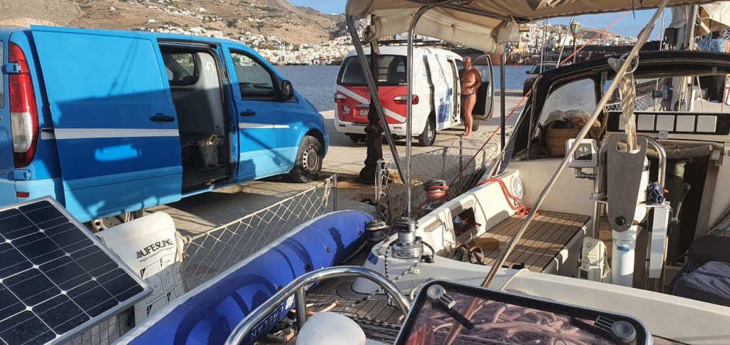 Our hearts stopped and spirits plummeted when, 2 minutes after our departure our horrible noise started up again.  A 180’ turn and a phone call to Stamatis and Georgios who arrived pronto, puzzled, we took them out to sea, the Shaman stood on deck, arms loosely at his side, palms open wide, inclining his head gently this way and that as if invoking the Gods for an answer……….. It has to be from outside the boat, a quick call later to Stavros at the appropriately named ATLAS yard and we are motoring into a cradle, driving forward, full power up what seemed to me to be an angle of 45’!  Suddenly I felt a bite, I stopped the engine and felt us secure and being pulled now by the tractor into the yard.  First look and it IS the ****** rope cutter after all, grinding and rattling having lost some of its plastic washers or some such.  By the afternoon the whole assembly had been removed, the underside of the boat inspected and we could go; only there was a problem.  One of the wheels was missing from the trolley cradle.  We stayed the night aloft high and dry and the next morning, a new tyre fitted, we were trundling back into the sea when everything suddenly stopped and like a VIP visit, a ladder was produced and none other than Stamatis comes springing up – he must be over 75.  “I will come with you, I will listen”  Yay! No noise! So, satisfied, we were now to come up alongside a barge and he would leap off ‘like a mountain goat’ I said and he chuckled, probably at my bad Greek!  As we approached, we couldn’t understand why the usually friendly people were waving and shouting – Oh No! the barge was newly painted and probably still wet, unhindered and unflurried, Stamatis leapt across and, with everyone now pushing us away and some skilful helmswomanship, we were off without a smear on either barge or Selkie Dancer.