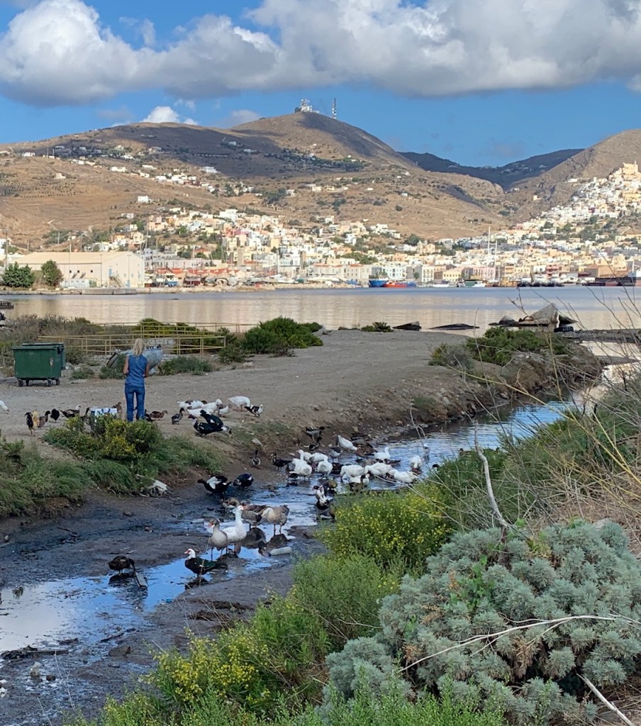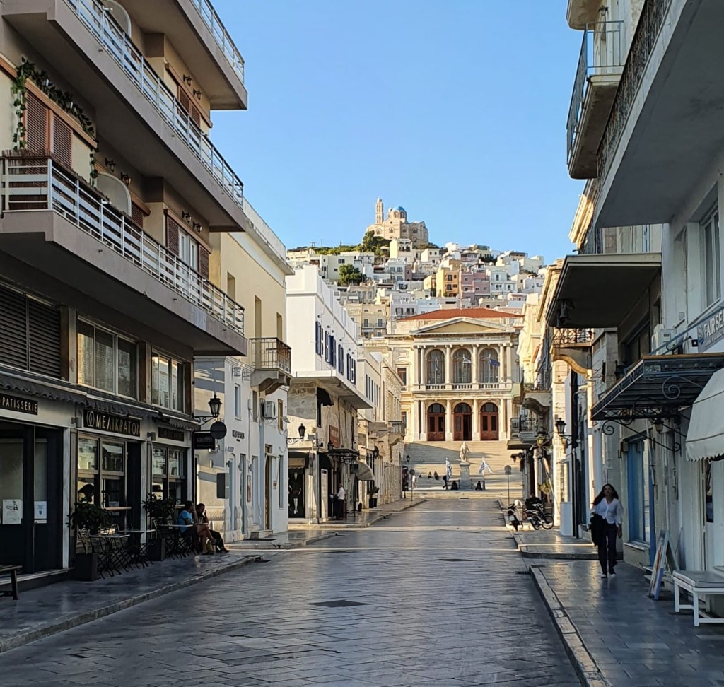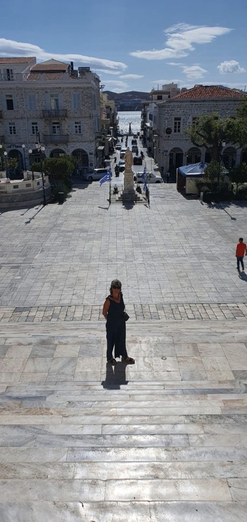 On the Sunday we daundered slowly into the city and visited the very small Archaeological Museum in the town.  It is housed in the rather grand town hall built during Syros’ prosperous 19th century when it was on a par with Athens and was home to the industries mentioned above.  It looks out onto a very elegant, spacious square, a great place for coffee and people watching.