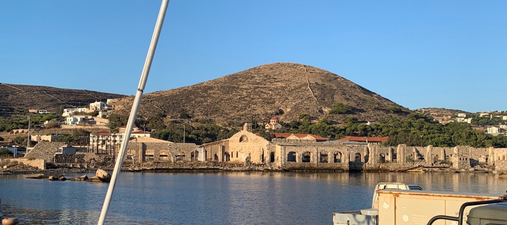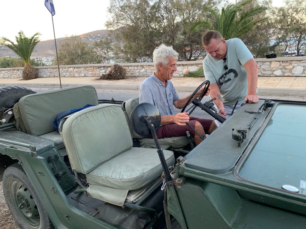 We go for a walk and meet an American ex serviceman and his Romanian wife who have a house here and also an American M151/82 Jeep circa 1958.  He is very insistent that we come for a spin in it, that we actually drive it!  I volunteer to be the photographer and sit in the back.  Boys love this!  We return to the boat in the dark and tied onto a line in our cockpit is a present, a gift from Stamatis of local Syros specialities, nougat and masticha – how kind.  Tomorrow I will bake a batch of biscuits to give him.