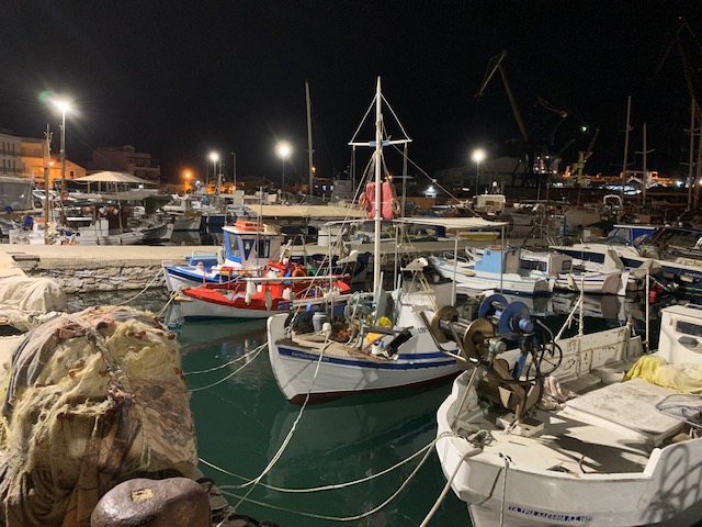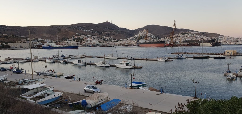 We had supper that night in the fishing port at a great little local restaurant called Luse Dese.  The food was so tasty that we have been back two or three times.  The welcome, the service and the super view combine to enhance the experience.  By day and by night the vista here is interesting.  The huge Neorion shipyard works and cranes form a backdrop to the fishing boats with enormous bulk carriers in the dry dock towering over a hotchpotch of vessels large and small, traditional and custom made all of them colourful individuals.