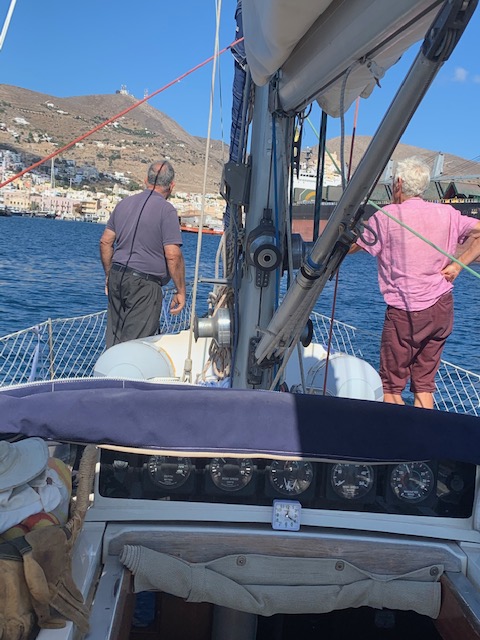 Our part had arrived on time and Nikos had texted to arrange the work for the following day. True to their word the team arrived.  Nikos had to dive to stuff something up the propeller shaft so that the sea would not enter the boat – pretty important.  Georgios and Stamatis worked quietly for an hour.  When all was done I started the engine and tested it forward and back straining on our tied lines.  They were satisfied, were we? we think we were.  Hurray, all done by about 1030 so we packed up the laundry and took the free bus into town. We had coffee in the square and nosed around the town hall building.  We walked back to the fisherman’s harbour and took lunch – so delicious.  We are all ready to go pick up the laundry tomorrow, fill with water and GO!