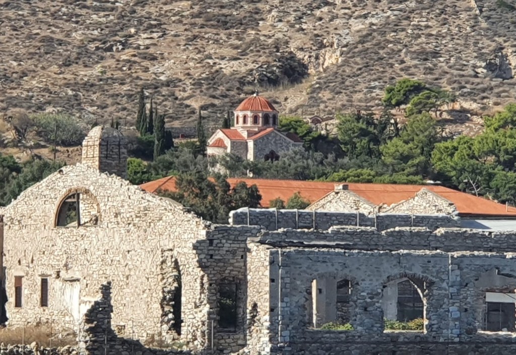 I had spied a handsome looking church surrounded by cypress trees and greenery so we decided to try and find it.  This was easier said than done and to cut a long story short it is within the boundary of a military barracks area.  We found the big gates and as I peered in I could see behind that there was an armed guard and on the outside fierce notices forbidding photographs.  So, discretion being the better part of valour we called off the search.   The barracks area was huge, as we could see from our walk, and most of the buildings were falling apart.  The red roofs undulated with unstable tiles; windows were missing and nature was definitely in the ascendant.  However there must have been one building serviceable because Nikos, the diver, told us that his son is doing his national service there.  They don’t DO anything but sit around playing cards and getting bored.  What a waste!  At least you could go to a different area of Greece, learn something useful or do community service.